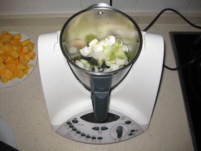 Cuando acabe el tiempo programado anteriormente incorporamos al vaso de la Thermomix la calabaza y la patata, junto con el agua.